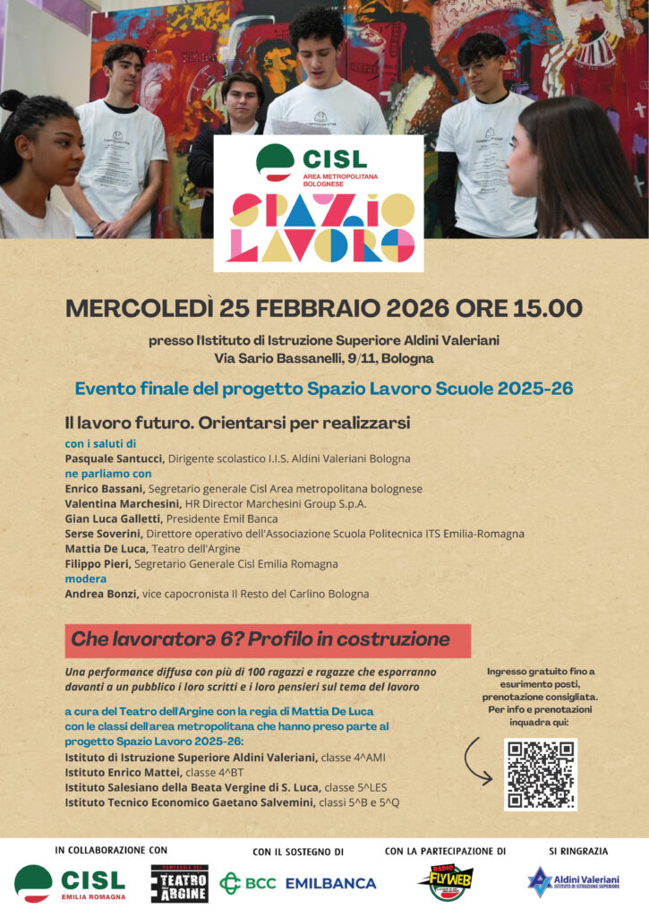 Cisl Area Metropolitana Bolognese, in collaborazione con Cisl Emilia Romagna e Teatro dell’Argine, ha coinvolto studenti delle classi 4° e 5° degli istituti superiori di secondo grado, di diverse scuole del territorio metropolitano in un percorso di orientamento creativo.