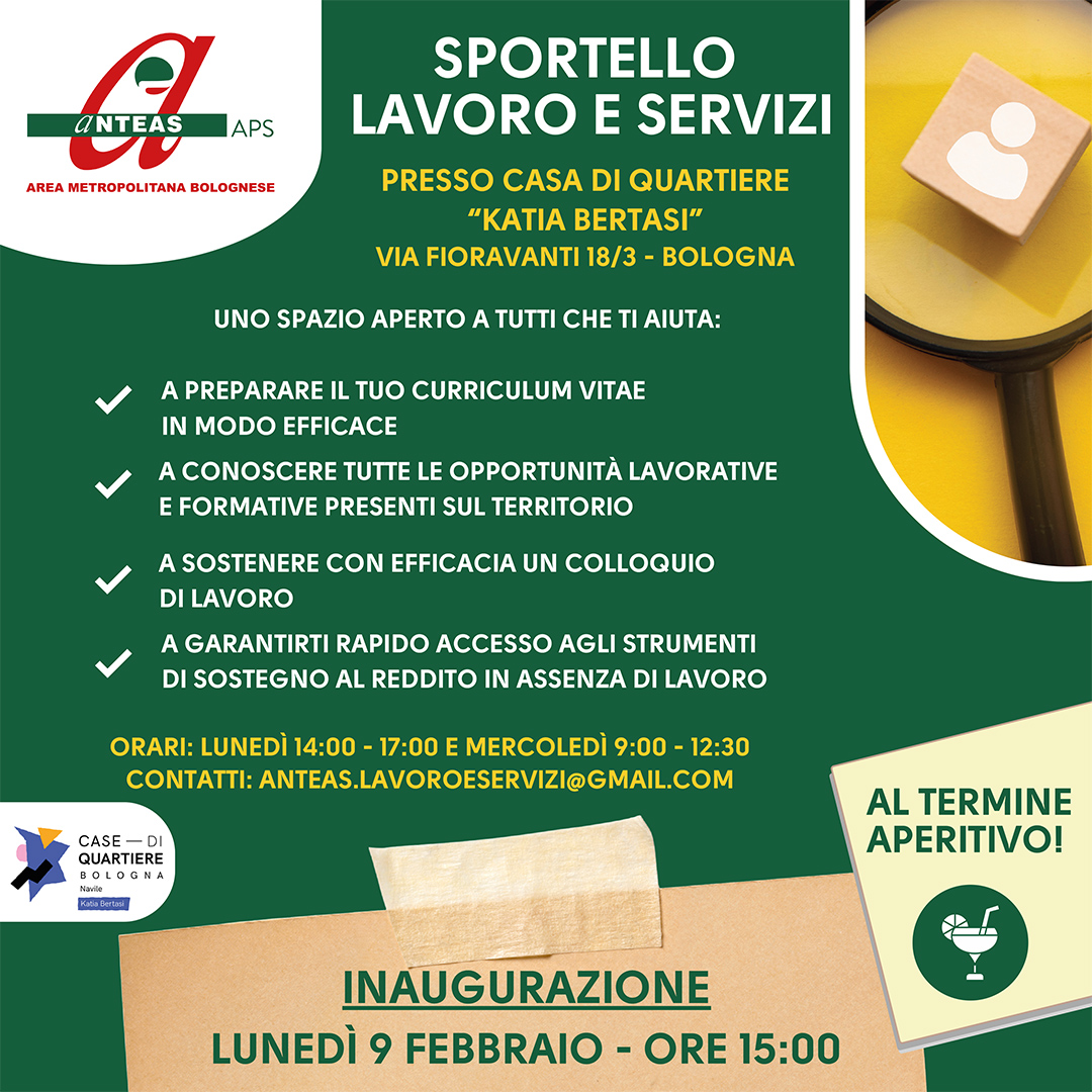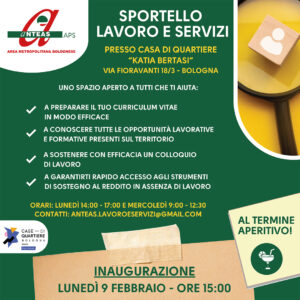 Tra i vari progetti, nel mese di febbraio, partirà lo sportello di orientamento formativo e professionale, “Lavoro e Servizi” presso la Casa di Quartiere “Katia Bertasi”, in via Fioravanti 18/3 , a Bologna, pensato per supportare le persone nella ricerca di formazione e occupazione.
